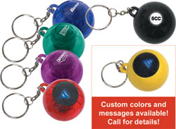 We can print your company logo on top of our stock Fortune Balls or Mini Fortune Balls and keychains. We also have a 2.75" size as an alternative to the 4" balls or the mini keychain size. Our minimum order is 50 pieces. The outer shell is also customizeable in several colors, now including glow-in-the-dark and translucents! For orders of 250 pieces or more we can also customize the 20 answers inside to create a truly unique promotional item for your organization. This unique specialty promotional item can be used for any creative advertising or marketing project. Contact us today!