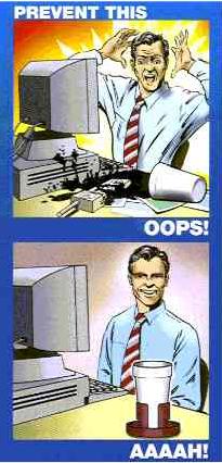 It's happened to all of us. We eat and drink too close to our computer. We bring coffee or soda to our computer and it spills all over. What a mess...ruined keyboards, papers, phones, electronic equipment, etc. Black gook all over the place, even the carpet. Millions of dollars in damages are incurred every year beacuse of spilled beverages. According to the Wall Street Journal "Liquids are a big problem, particullarly sticky liquids containing sugar which can jam keys, and what's more, attract insects. Computer makers are fielding cries for help too, for soda induced keyboard failures." The surest cure is prevention. Our patented 'No Spill Drink Holder' can do the job. It's designed to hold all kinds of cups and mugs to prevent tipping and spillage. Simply place your mug or paper, plastic, or foam drink cup into it and the problem is solved. It's nearly 100% effective in preventing accidents, spills, and messes that can ruin your day (and your stuff).